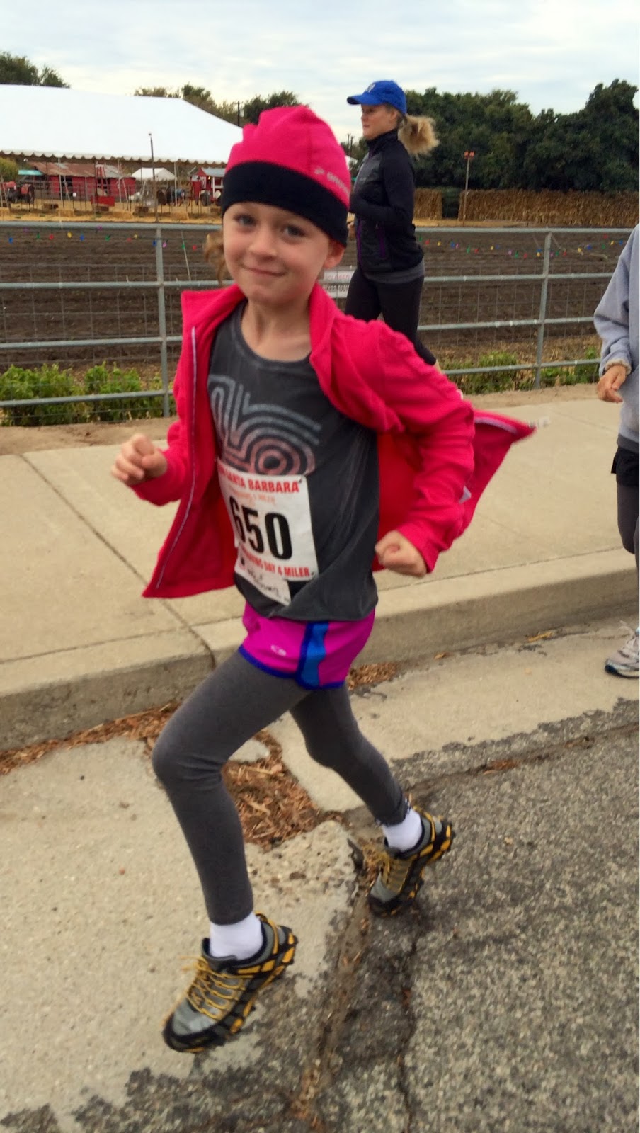 I had a new running partner for the annual Santa Barbara 4-Miler Turkey Trot this year...Sophie, my 7-year-old daughter! Despite having only run a mile once before, she said she was game this year. I thought I was going to burst with excitement. I have always wondered when and how one of my girls might join in for a race, and all it took was the promise of free powdered doughnuts! (Sophie is ready to run!)We started off with a few sprinkles of rain as a record 700 runners filled Hollister Avenue to get their Trot on. The Turkey Trot is quickly becoming a national phenomenon, topping out at 800,000 participants last year (25,000 in San Jose, CA alone) and possibly crossing 1 million this year. The SB Turkey Trot was no exception, already 7-8 times bigger than my first running over a decade ago. But thanks to a nervous Sophie at my side, it felt like my first! She took the rain in stride, using it as an excuse to wear as much pink as possible. (Sophie joins the fun! Check out those inov-8 x-talons...size 2!)Running beside Sophie was such a joy, and if I smiled any harder I was likely going to break my face. Such a thrill! We jogged along at a steady pace, enjoying the costumes around us, and took our first walk break at mile 1. A 10:30 min/mile...I was so impressed! By mile 2, she had shed nearly all of her clothes (making Daddy the sherpa) and took to the trails aside the bike path. "Trails feel faster, Daddy". Chip off the ole block, I tell ya. (Turkey hats rule!) (Sophie sheds a layer and takes to the trails!) (Thank you, thank you, thank you photo gods for this one - grandparents, prints are on their way!)By mile 3, Sophie was a panting mess, but pressed on, determined not to be last. She swore she would never do this again, and I told her that all runners say that at least once in every race and forget all the hard parts immediately after crossing the finish line. Once she smelled the doughnuts, she sprinted to the finish and right on through to the snack line. I think she ate three before taking a breath, and the powdered sugar soon covered her face like a culinary explosion. She dropped a handful of sweat-sticky doughnuts into my palms, and we plopped down and easily negated all the calorie burn of our 53 minute 4-miler with a blur of NOM-NOM-NOM. (Hooray for Sophie!) (Doughnuts never tasted so good)By the time we headed to the car, Sophie was already talking about coming back next year. She busted up laughing and said "you're right, Daddy! I have already forgotten all the hard parts. That's so cool." I think she's hooked! Papa (my Dad) said it best...I've got maybe 12 years tops before Sophie Jane leaves me in the dust. A little more than a decade before she desperately asks me to take down this post so sports journalists and would-be boyfriends stop linking to it and making jokes about powdered doughnuts (never!). I sigh knowing I likely have less than two years before holding hands with Daddy on walk breaks isn't cool anymore. As eager as I am to see how she blossoms, my heart already clutches fiercely at these fleeting moments. I guess that's what parenting is all about. ...and we'll keep our eyes on Quinn for the kids race next year! ;-) (A very stylish 3-year-old Quinn chills with Martha - you're next, kid!) (Toddlers take on the kids race!)Happy Thanksgiving, all! - SD