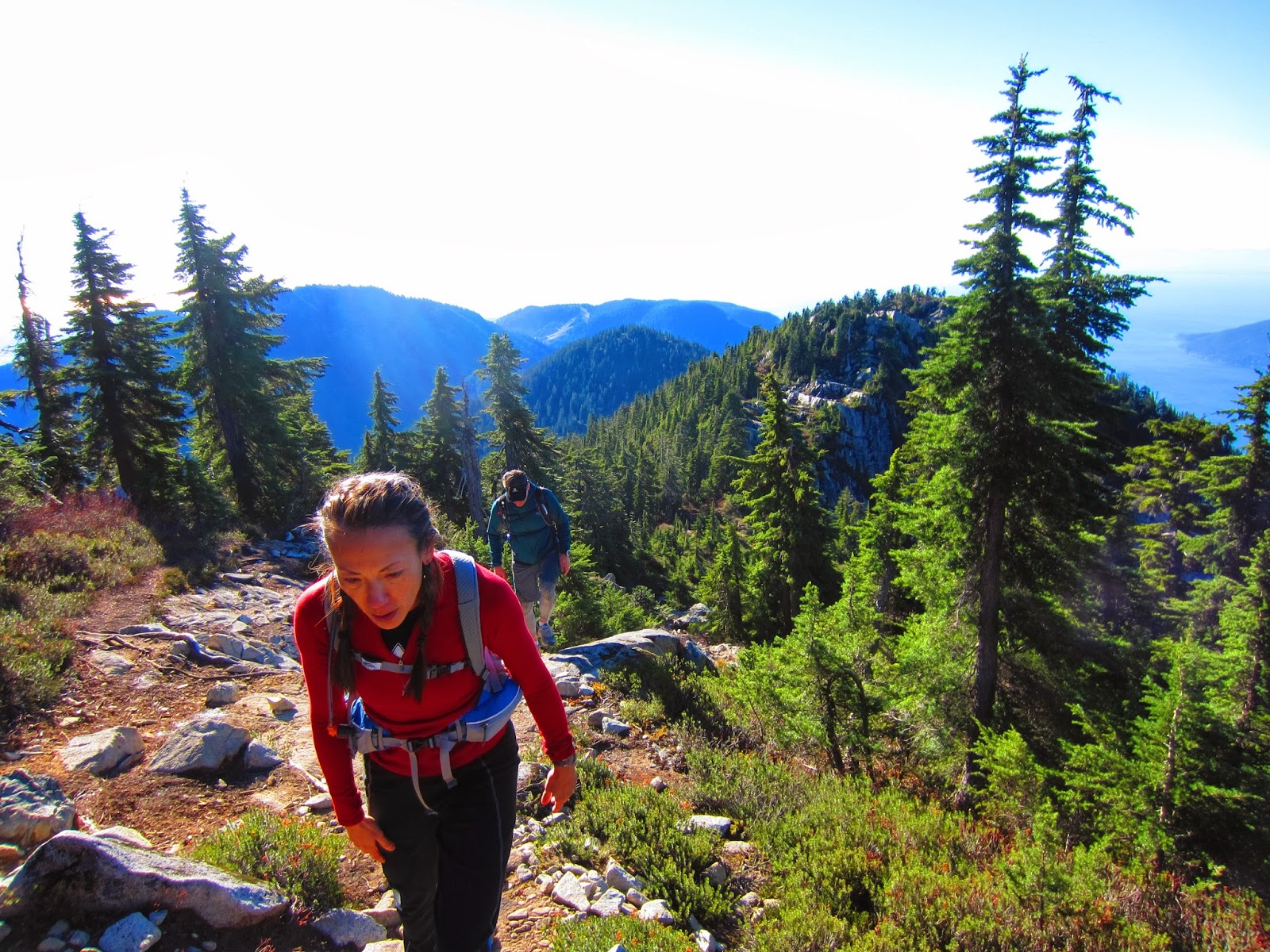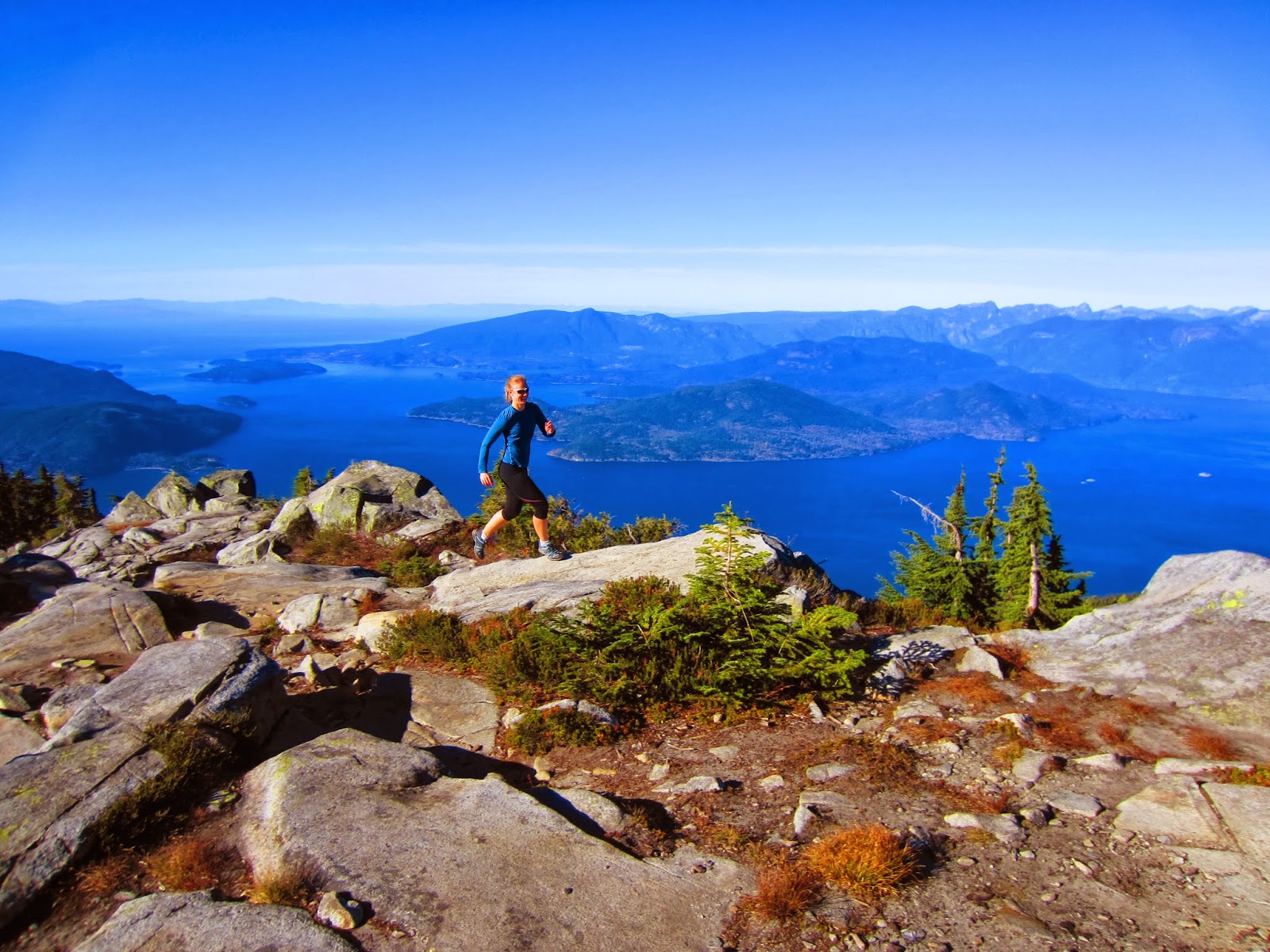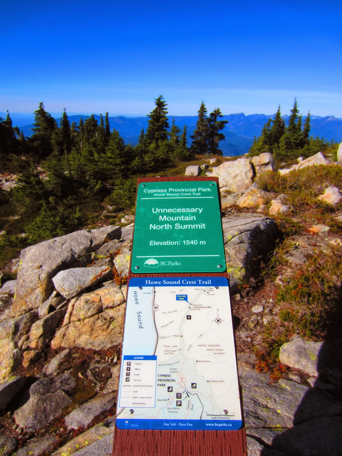 I've been wanted to run or hike the Howe Sound Crest Trail for many years now. It's at the top of my local bucket list. I'd been hoping to cross it off this summer; but didn't want to compromise my newly-healed stress fracture. So instead, a couple running friends and I had toyed around with the idea of scouting the route; doing the first few peaks to get an idea of the terrain and how great a challenge the whole trail would be. Today our scouting trip finally came to fruition. And what a day it was! The Lions Francine, Cam and I started at 9am from Cypress. We found our route and were pleasantly surprised that the first 3km of the trail had been recently reconstructed and was very runnable. So groomed and wide you could probably take an off-road wheelchair on it in fact! On our return trip we met some Park Rangers who informed us that eventually the improved trail would extend all the way to the top of Saint Marks. Our glee was overtaken by grunts as the trail turned into the rocky, root-filled remaining 2.5km ascent of Saint Marks. Saint Marks is the first mountain you 'bag' along the Howe Sound Crest Trail and is a relatively popular day hike. We were quite surprised to actually make the ascent a little over an hour after we'd started. Humm, we thought, this is going rather well! The view over Howe Sound was incredible; not a cloud in the sky after almost 2 weeks of fog. The sun was warm on our backs and the air was crisp. We had timed things right. I pointed out the various islands to Cam and Francine and sent a hello to my mom, who had always wanted to hike the Lions, but won't be able to cross that particular item off her bucket list. Looking over Howe Sound. Bowyer Island in the foreground, Bowen Island to the left, Gambier to the right, Keats Island and then the Sunshine Coast in the background. Stunning! Taking in the view (Photo Credit: Cam Eldred) Proof! Francine & I at the top of Saint Marks (Photo Credit: Cam Eldred)We'd summited Saint Marks faster than anticipated, so we carried on towards Mt. Unnecessary. As we descended Saint Marks to the saddle, I commented that hey, the trail really wasn't as rugged as I'd been lead to believe. Well, I spoke to soon. A signpost warned us that the maintained trail was about to end. And it did; fallen trees lay helter skelter and the singletrack trail became more overgrown and less developed. That said, it was passable and there were ample trail markers, but it was certainly a hike and not a run. There was a little false summit on the way, that I was certain was the South Peak, but according to our Park Rangers was just a false summit of Mt Unnecessary. We took some time here enjoying the view, taking some photos, and snacking. Why do yoga in a studio? (Photo Credit: Francine Hong) Not too shabby a view! (Photo Credit: Cam Eldred)We continued on upwards for a stretch until we made it to the South Peak. Like I said, this was a bit of a surprise as I'd thought it was the North Peak. Francine & Cam trekking up to the South Peak of Mt Unnecessary With the Lions in the background (Photo Credit: Cam Eldred)Even though we'd gotten the 'money shot' we were looking for I didn't want to turn around before summiting the North Peak of Mt Unnecessary as well. I'd been joking all morning that we would end up doing the whole HSCT, well, maybe not, but I at least wanted to finished first third. So we carried on, down the South Peak to the col, or saddle. This section had a small rock face section with a rope and a minor ledge to navigate. No problem for us, but I wouldn't want to tackle it on a slick, wet day. The North Peak was a mere 20 minutes away. And at 1542m, the highest point on the HSCT as long as you don't actually summit the West Lion. Trail markers were plentiful but this particular sign was rather weather-beaten! Does it get any better than this? What a fantastic day! It was a 4.5 hour run trip for us (not including photo and food breaks) and I'm just thrilled to have gotten as far as we did, even if it was 'the easy section'! Next year I am crossing the whole HSCT off my list and I sure hope to have as nice a day and as great company to do it with!