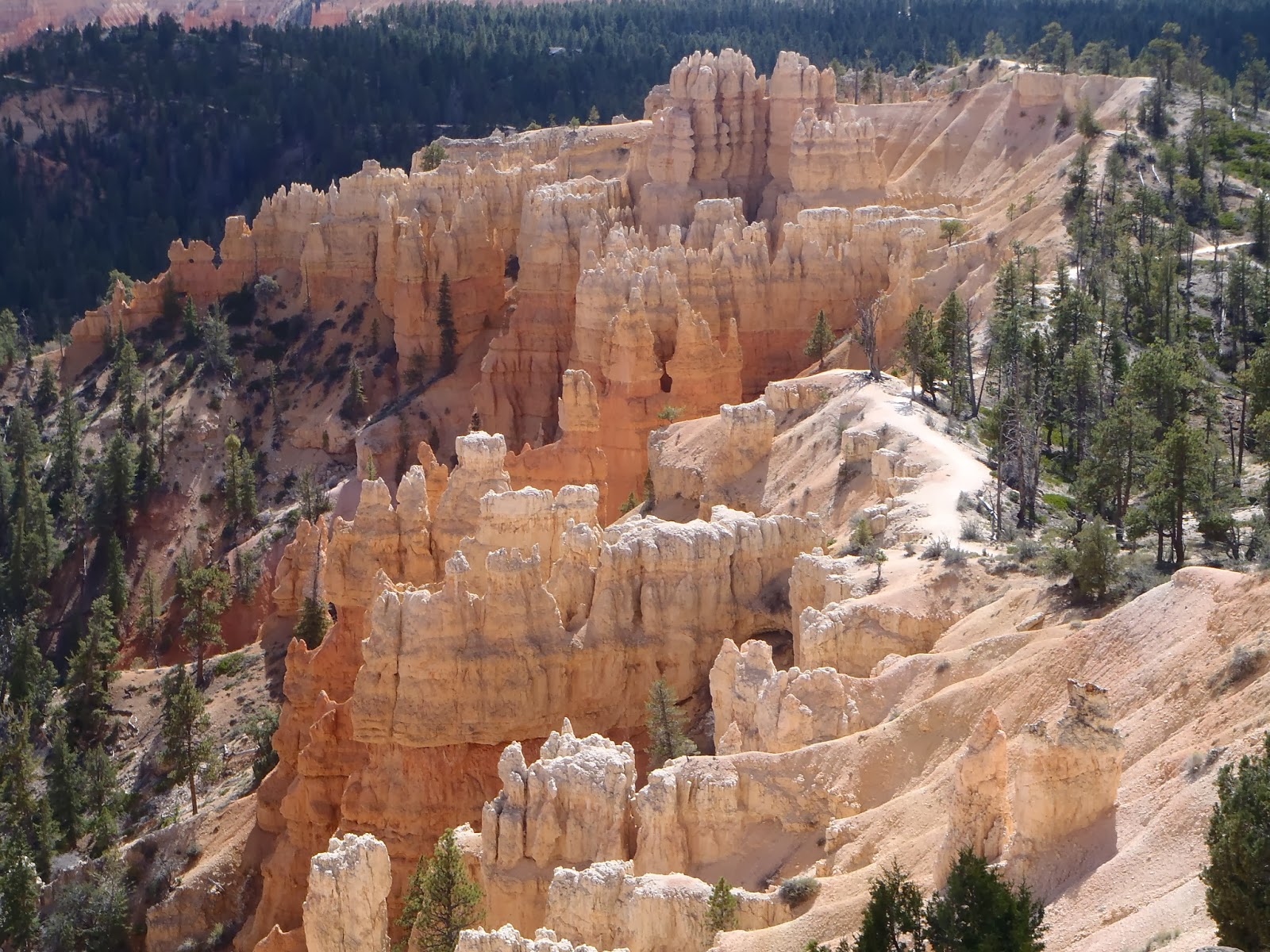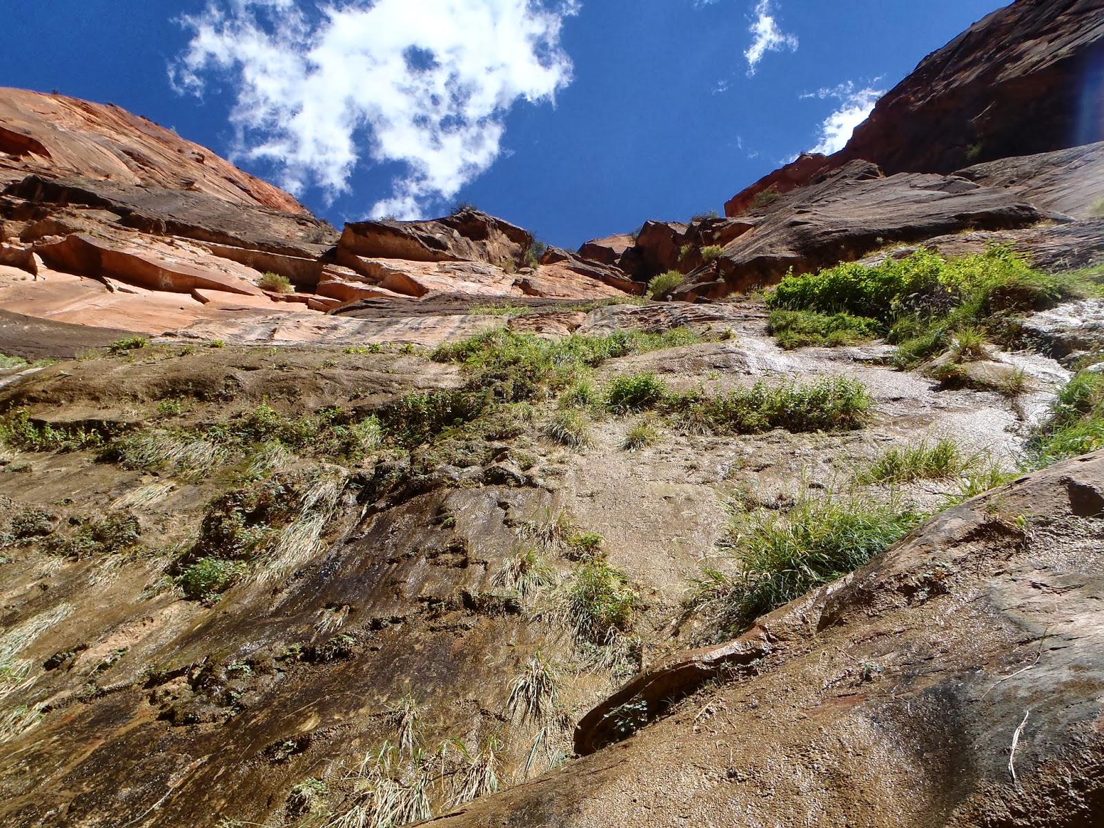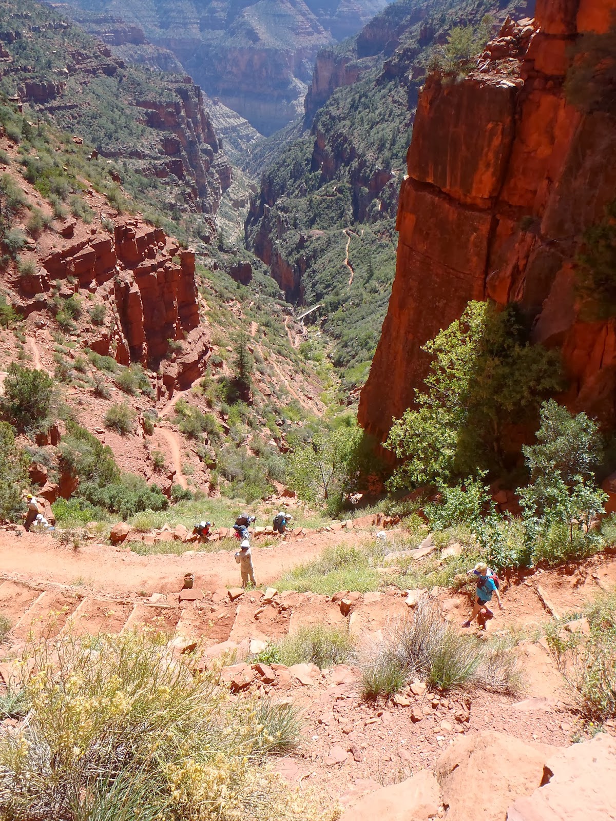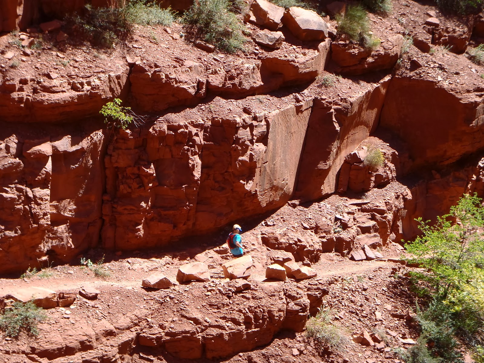 Something wonderful next happened. A breeze was felt in my face. Within minutes, the terrible sick feeling went away and energy reappeared and I felt cooled. I tried to run. It worked. I continued to squirt myself with cool water and filled up again at the next stream. I pushed the pace even more and very soon I could even run the uphills on the tough Highline trail. Could I catch those two guys? They were probably almost a mile ahead but I could try. I kept looking for them around each corner but they didn’t appear. At one point I thought I took a wrong turn, went back and ran into a female runner who I had passed on the rim. She was doing well. We ran together for a while but I knew I could run faster so I soon bid goodbye and started running up and down the trail like crazy.