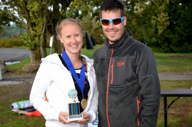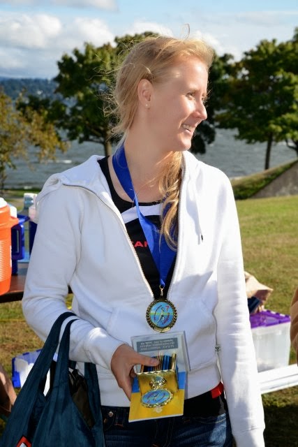 We got changed and had an great vegetarian post-race meal. As we were sitting there trying not to get blown away, freshly baked pies and door prizes were given out. Then came the awards. Everyone got a finisher's medal and the top 3 in each age group got a trophy. Awards were presented by the racer's travelling or running companion. It was, as I say, a wonderful community feel.