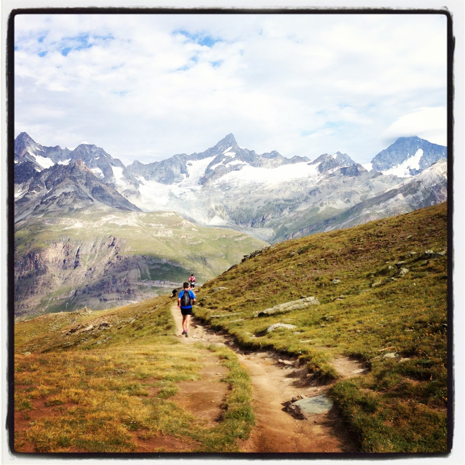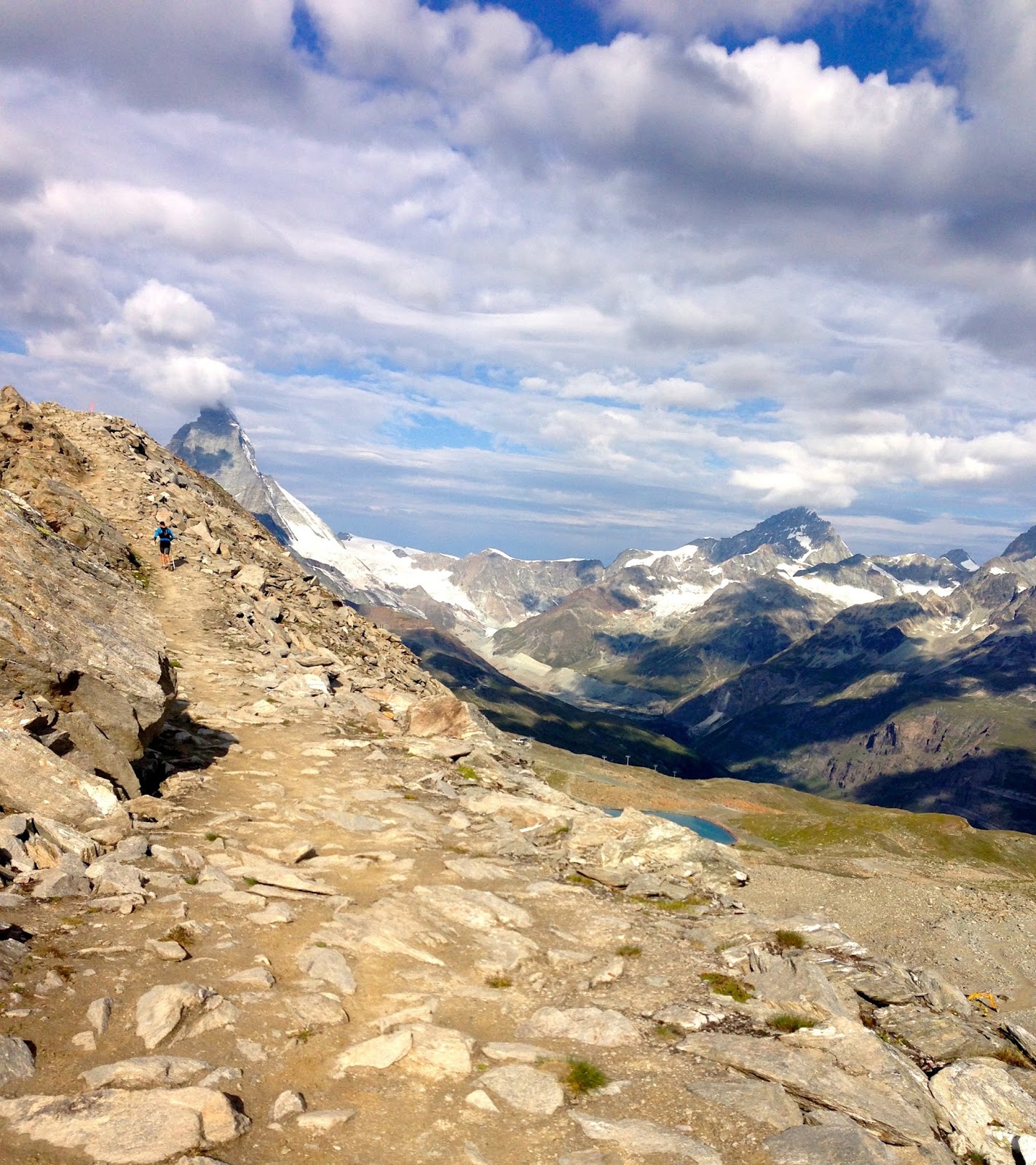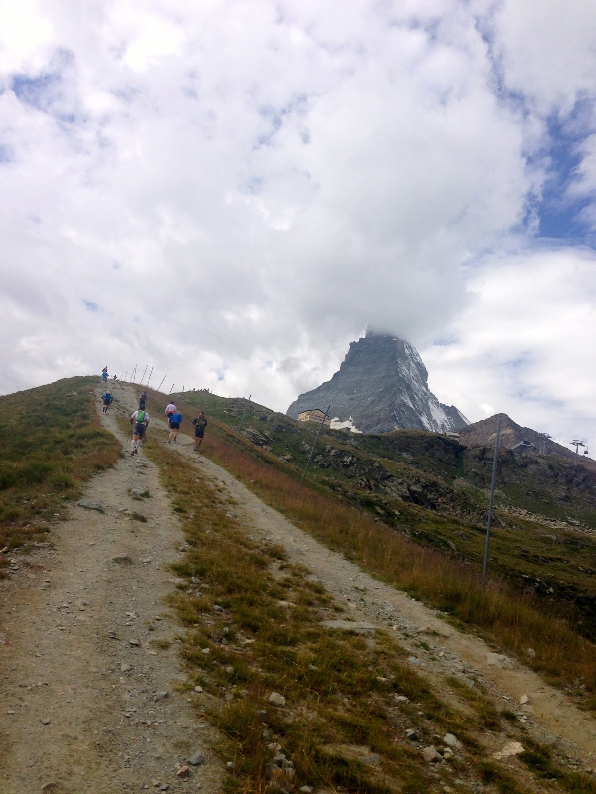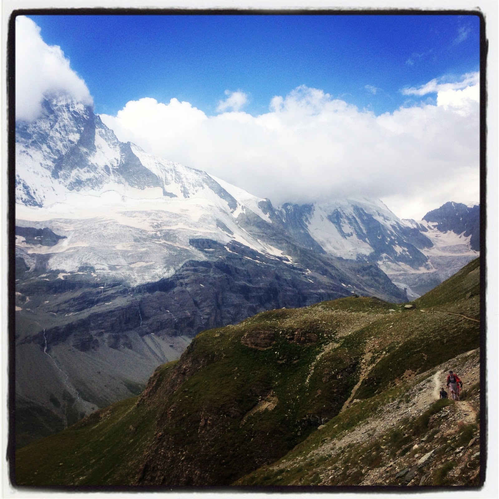 The last climb was larger than I recalled from the map (but then again, aren’t all last climbs?) and full of Swiss, German, and Japanese tourists taking in the sites of the Matterhorn and some nearby waterfalls. I sensed a deep cultural appreciation for the mountains among all these smiling faces, and they were happy to step aside and give out a “Hop! Hop! Hop!” or “Allez! Allez!” as we went by. The clouds were coming in faster now, cooling off what would have been a hot day on the ridge.