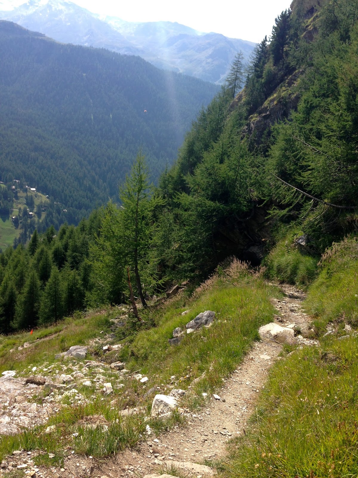 At mile 21, we hit the top of the climb and onto some delicious single track stretched along the “hunters route” on the ridge with Zermatt just a row of toy houses on our right. Such a beautiful stretch, yet it felt so remote…this course really has it all. The trail was smooth enough I could shuffle along at a 9 min/mile pace, and much to my surprise, I began passing a few slower runners as they hit the 5 ½ hour mark and got that "ultra reality check". We hit one last aid station at the Hotel Trift (mile 24), a little chalet nestled in a protected valley that certainly had the friendliest dogs on the course. With a few licks and cups of Coke, I power hiked the last little climb with my abbreviated steps.