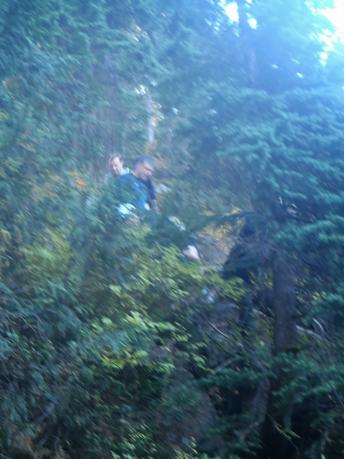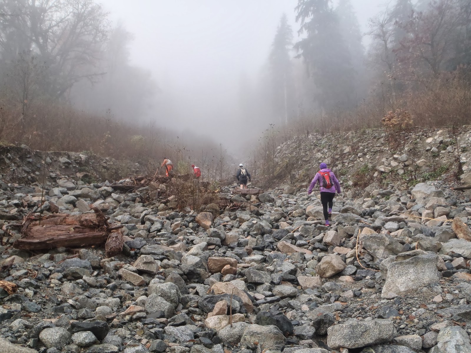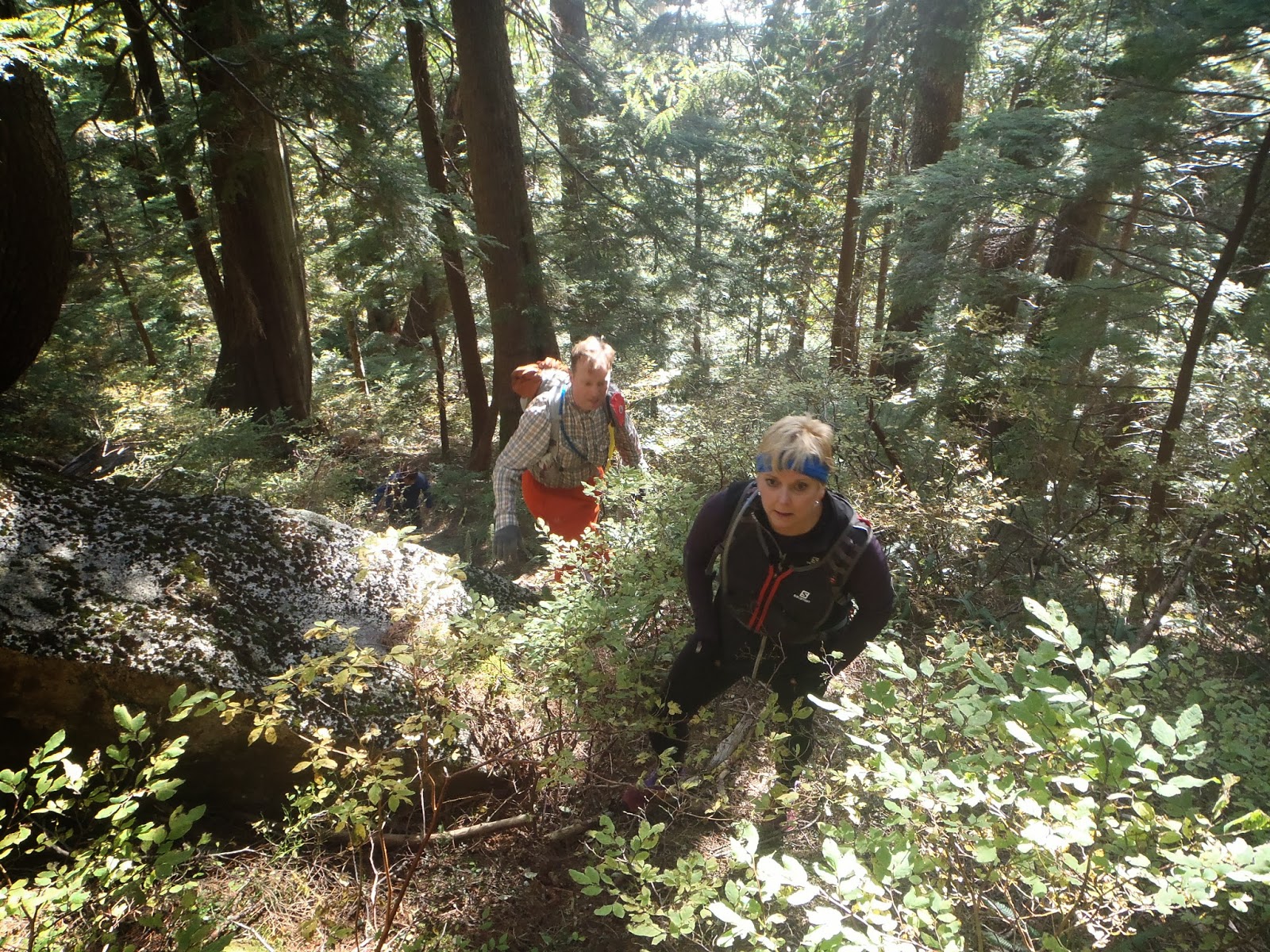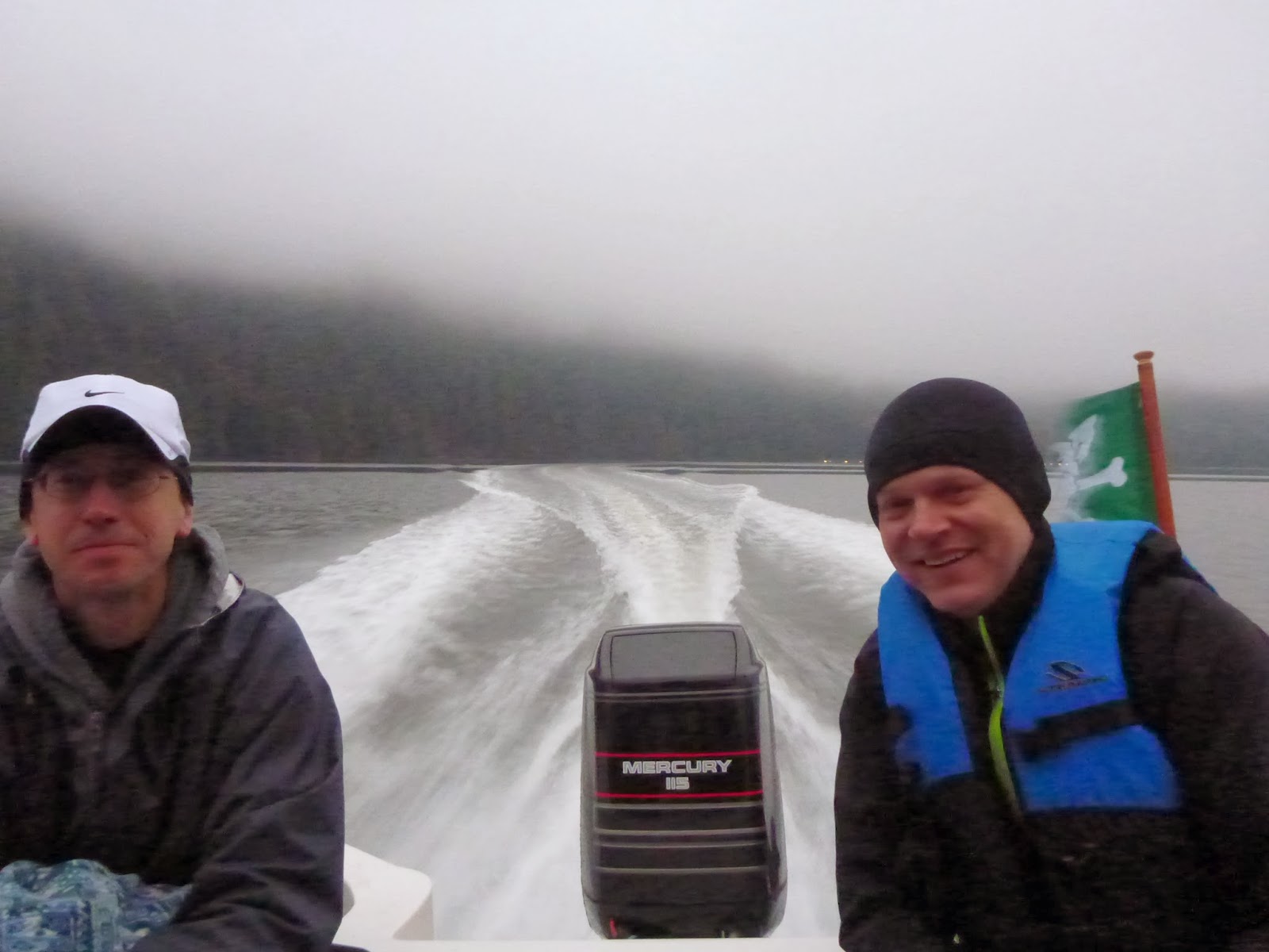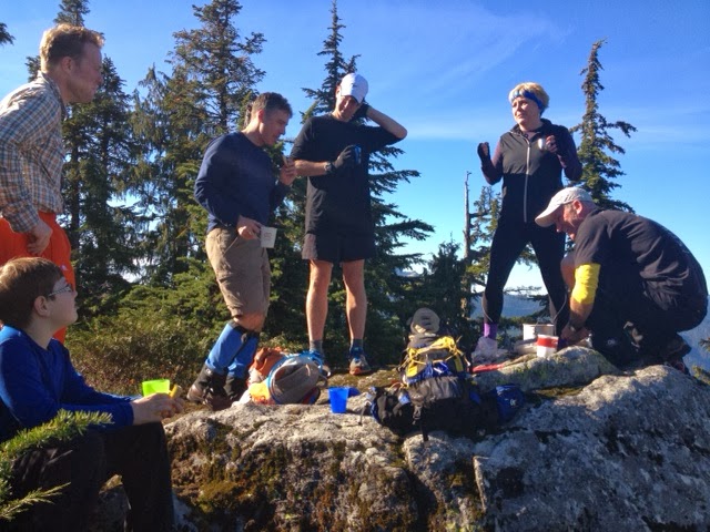 On Saturday morning Neil, Dave and I converged at 7am in the dark of dawn at Cates Park Marina, North Vancouver to meet the Captains of the good ship Green Dog. Ken and Tom. We were joined by fellow passengers David and his son Harry. After successfully loading and launching the boat we headed out into the murky and very misty waters of Indian Arm and set course for the Wigwam Inn where we would moor the boat and head up the trail to summit Mt. Dickens. It's going to be a good good day! It was perishingly cold on the boat, particularly for Dave and Neil who drew the short straws for the seats at the back of the boat. However, it was exciting for all as we really couldn't see very well and the navigational skills of the Captains and David became key to keeping us on track. Captain Tom Captain Ken David and Harry keeping a watchful eye for land masses. We made it to the end of Indian Arm, and unloaded onto dry land at the creek bed that has become our entry to the steep east side of Mt. Dickens. Historically, Mt. Dickens seems to have enjoyed some popularity as a local peak frequented by guests of the Wigwam Inn in the early part of the 20th century. Documented reports talk of Victorian ladies in summer dresses making their way to the top. This strikes me as somewhat questionable, particularly from the eastern approach, given the fact that the journey is essentially a steep bushwack from sea level to the summit at 4,225 feet! Anyway, off we went following on what is now becoming somewhat of a recognizable trail up Mt. Dickens. There were a few dead salmon lying around (spawning season) that were a bit frightening, they camouflage well with the rocks - only the smell of dead fish gives them away! Certainly, we Baggers have done much to open this route up. It is considerably shorter going the water route than coming in the traditional route on the other side of the mountain. It was steep. Typical West Coast forest It was about 4 hours up. And so after a few hours we burst out onto the Indian Arm trail some short distance from the summit. The Indian Arm trail runs south to north over the ridge summit of Mt. Dickens. It is an infrequently hiked long distance route established some years ago by local outdoors enthusiast, Don McPherson. So we gathered as a group there and made our way to the summit for a special celebration of Bagging success and trail camaraderie. Dave and I celebrating Completing the Peaks in the Bagger Challenge with this climb of Dickens Tom, Neil, Harry, myself and Dave. The first female completest and the Baggermeister of the competition. We had a great celebration on the top, a tea party! Ken made very good Chai Tea on his camp stove Plenty of celebrating and good reminiscing. David and Harry enjoying the views More tea, biscuits and laughter. On our descent, the fog remains below Here comes the Green Dog to pick up the weary baggers Bundled up on the boat - we enjoyed the views with the lights along the shore Neil and Dave braving the return journey. This was the final peak for myself and Dave in the Bagger Challenge list of all peaks. Neil completed a few weeks ago. This makes me the first female compleatist. Quite an achievement for Team Dodgy! We had fun at the top and enjoyed beautiful skies and warm temperatures while those at sea level were still in the fog. After some toasting of achievements all round - as well as peak success, Ken celebrated a landmark birthday recently, we made our way back down to greet the Green Dog. Reaching the water just as dusk approached we loaded ourselves back onboard to a feast of salty chips, 7 layer dip and refreshments. The Green Dog does a great job of catering to it's guests. It was a memorable journey back to Vancouver as darkness fell and the lights in homes along the coastline turned on to shine brightly along the waters edge. It was a great day out and many thanks to Ken and Tom for supplying the watercraft transport. Thanks also to David for "inventing" the Bagger Challenge which has kept the last five years full of fantastic memories of adventures in the local mountains. Lastly, congratulations to Neil, Dave and myself on completion of all peaks. Well done team and I hope you have enjoyed all the trail tails! I look forward to some new adventures and challenges but a return to Mt. Dickens would certainly be entertained - it's a classic and an awesome way to finish the peaks in the Bagger Challenge. See you fellow Baggers at the upcoming banquet!